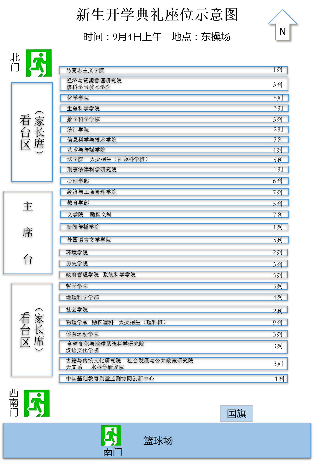 (2)新生以学部、院系为单位集合,由带队老师统一组织整队。 6:30前按指定地点集合完毕,由现场引导员统一引导入场,各单位要自带院旗,7:30入场完毕。